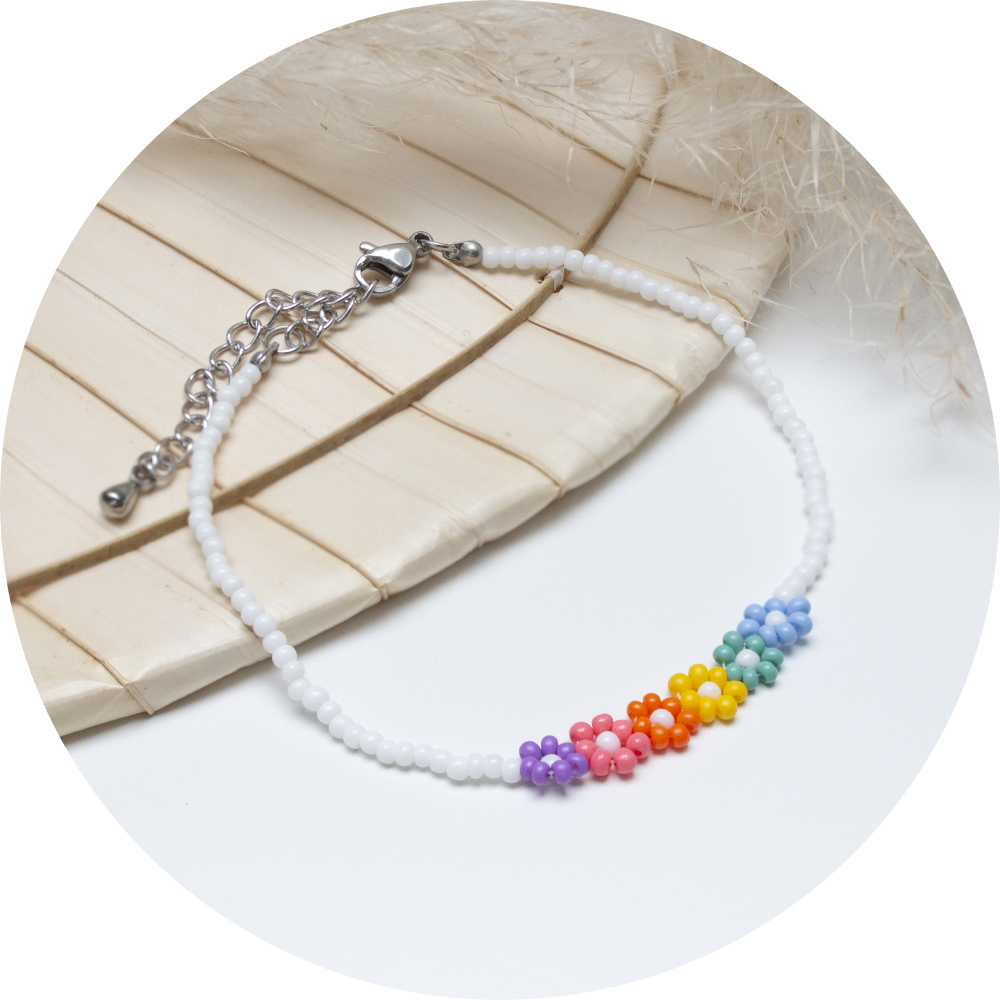 Dit vrolijke bloemen armbandje is gemaakt van gekleurde rocailles kraaltjes en is perfect om als cadeau te geven of om je eigen bracelet party compleet te maken.