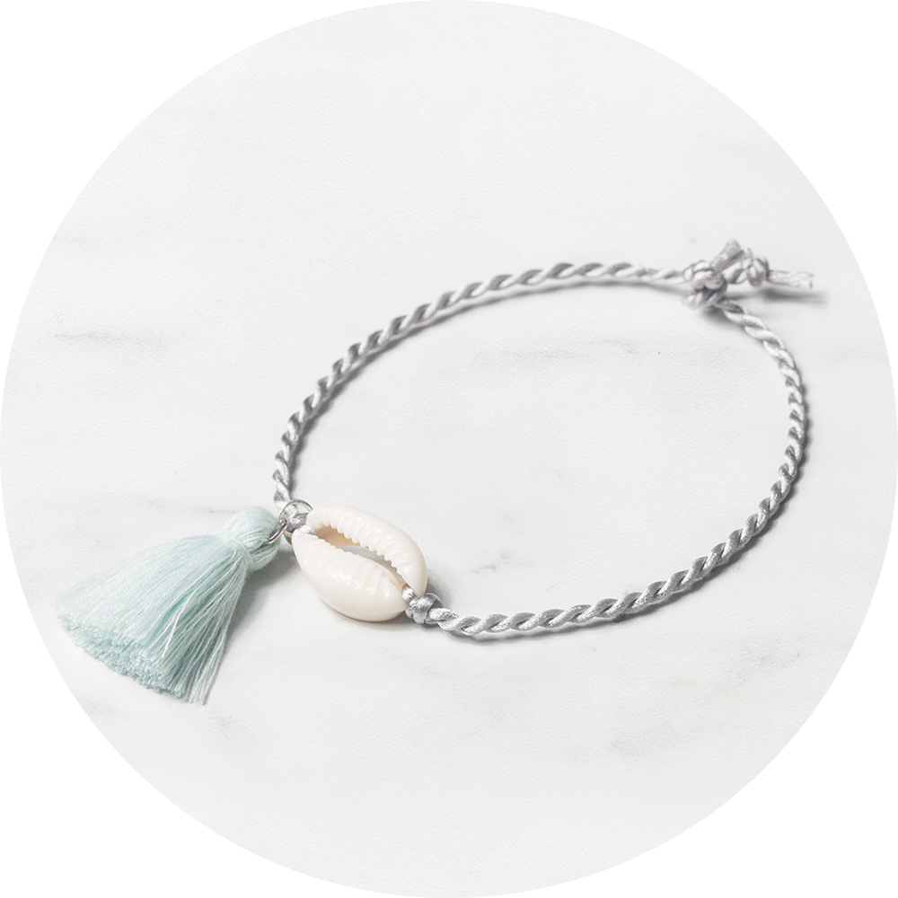 Het allerleukste grijs gevlochten touwarmbandje met een kauri schelpje en kwastje!