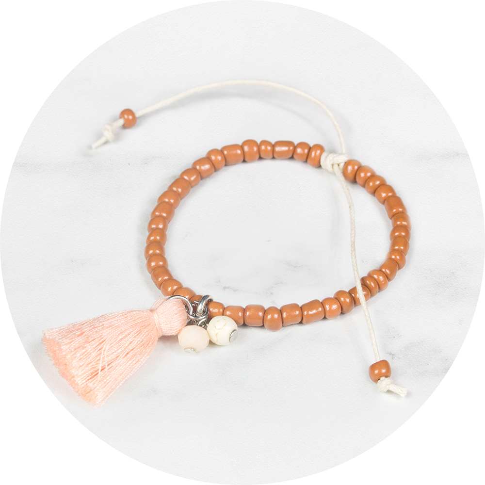 Dit superleuke fijne kralen armbandje heeft bruine kraaltjes en in het midden zitten verschillende bedeltjes.