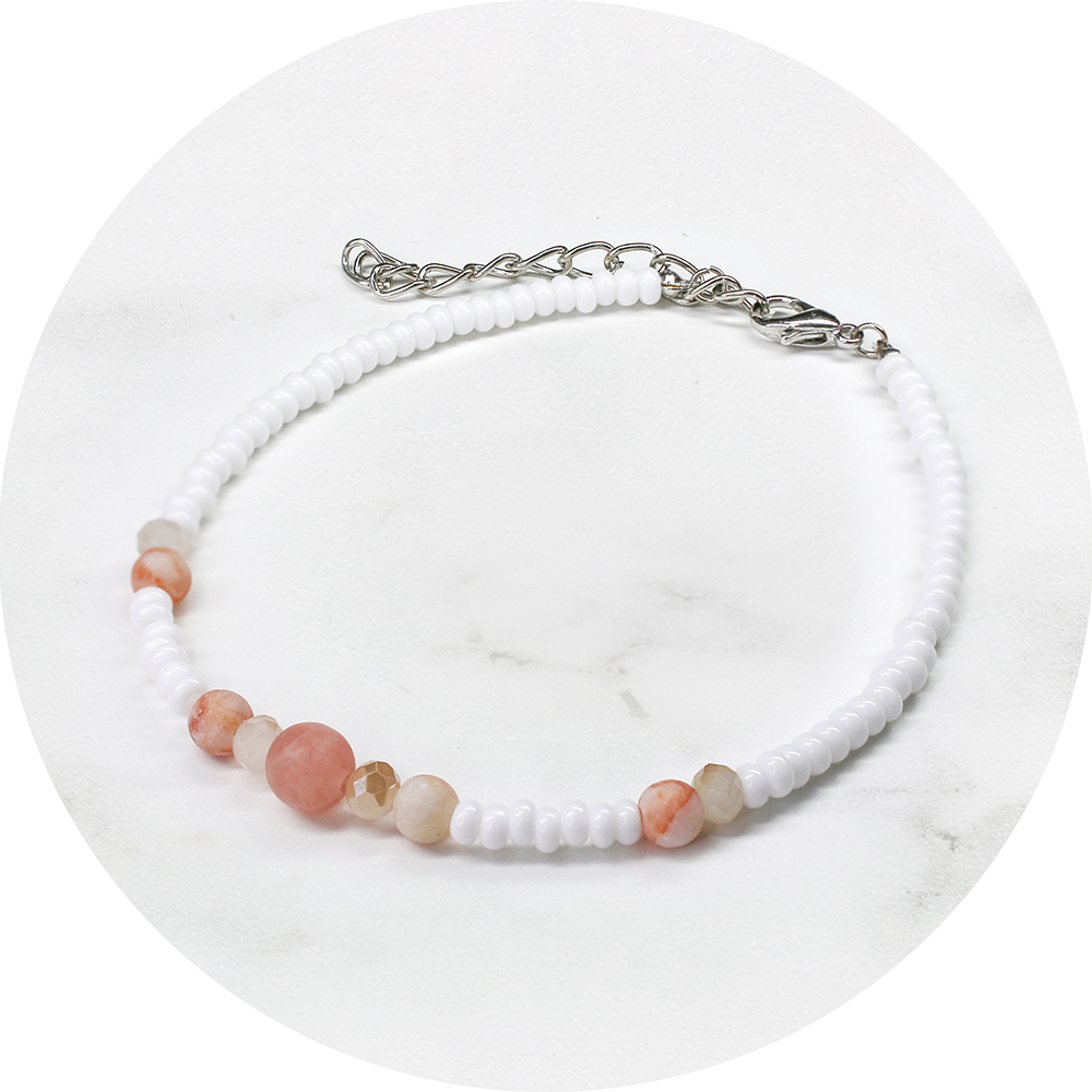 Het armbandje heeft witte rocailles met verschillende oranje glaskralen en is te verstellen van 17 tot 21,5 cm door het handige verlengstukje!