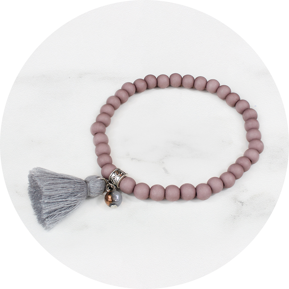 Het elastieken armbandje is geregen met oudroze acrylkraaltjes en heeft een grijs kwast hanger.
