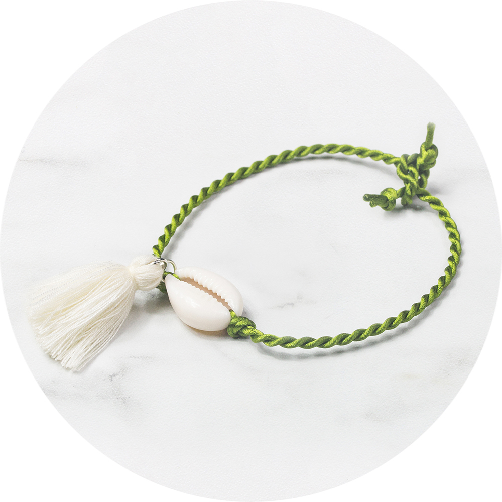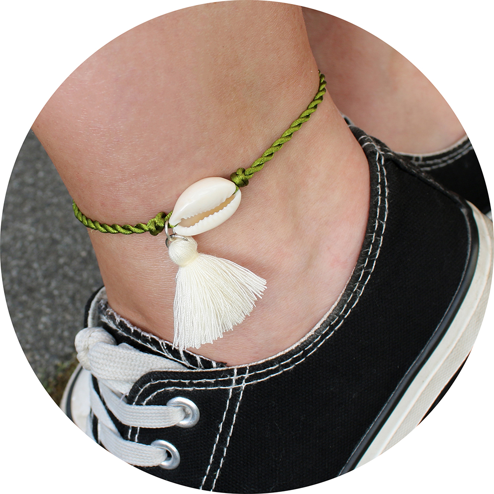Het allerleukste groen gevlochten touw enkelbandje met een kauri schelpje en kwastje!