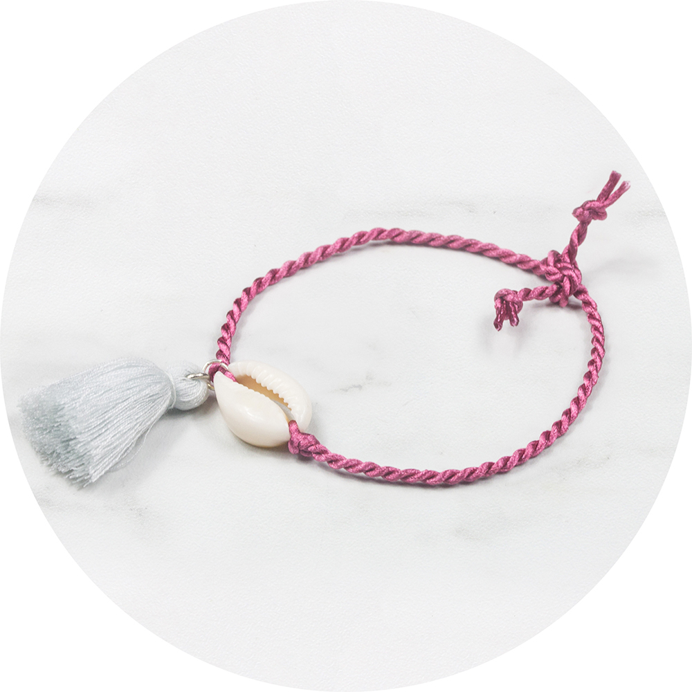 Het allerleukste paars gevlochten touw enkelbandje met een kauri schelpje en kwastje!