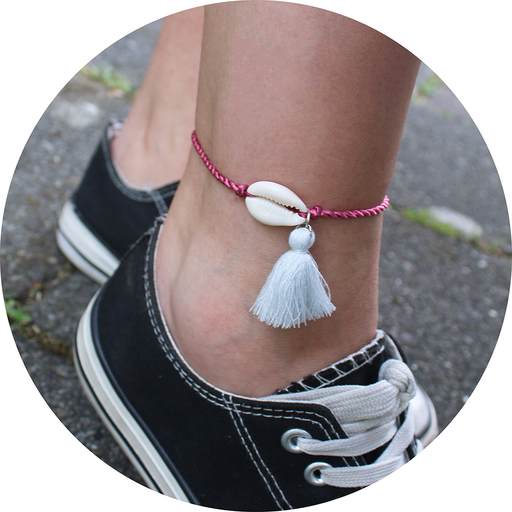 Je knoopt het enkelbandje gemakkelijk om de enkel en is verkrijgbaar in verschillende kleuren.