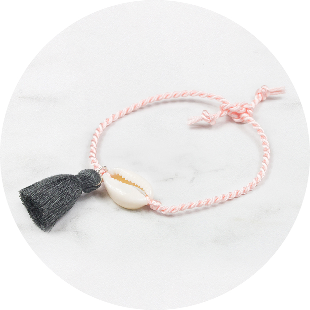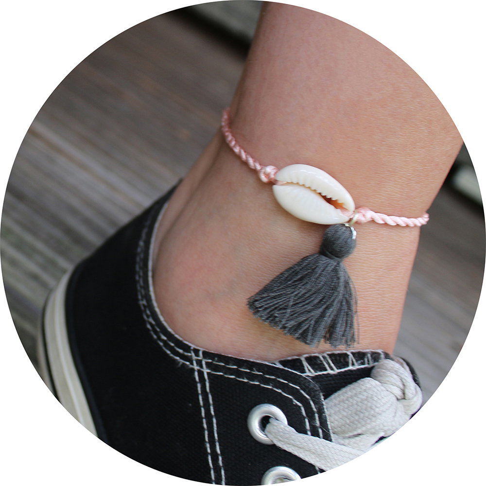 Het allerleukste roze gevlochten touw enkelbandje met een kauri schelpje en kwastje!