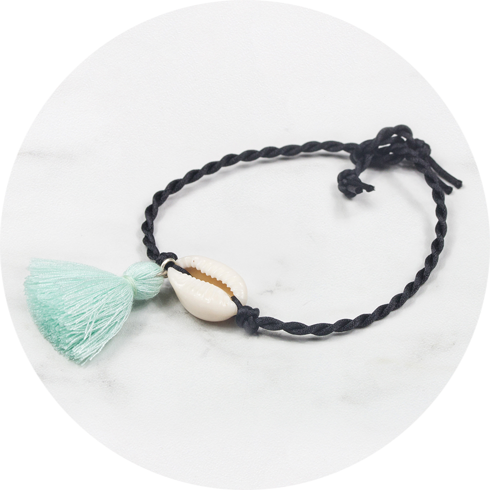 Het allerleukste zwart gevlochten touw enkelbandje met een kauri schelpje en kwastje!