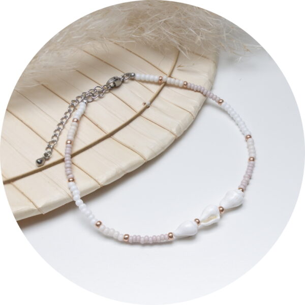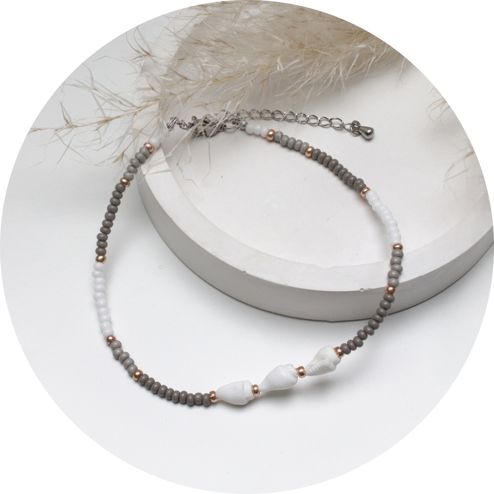 De enkelband heeft een RVS sluiting en is geregen met grijs/witte rocailles & echte schelpjes.