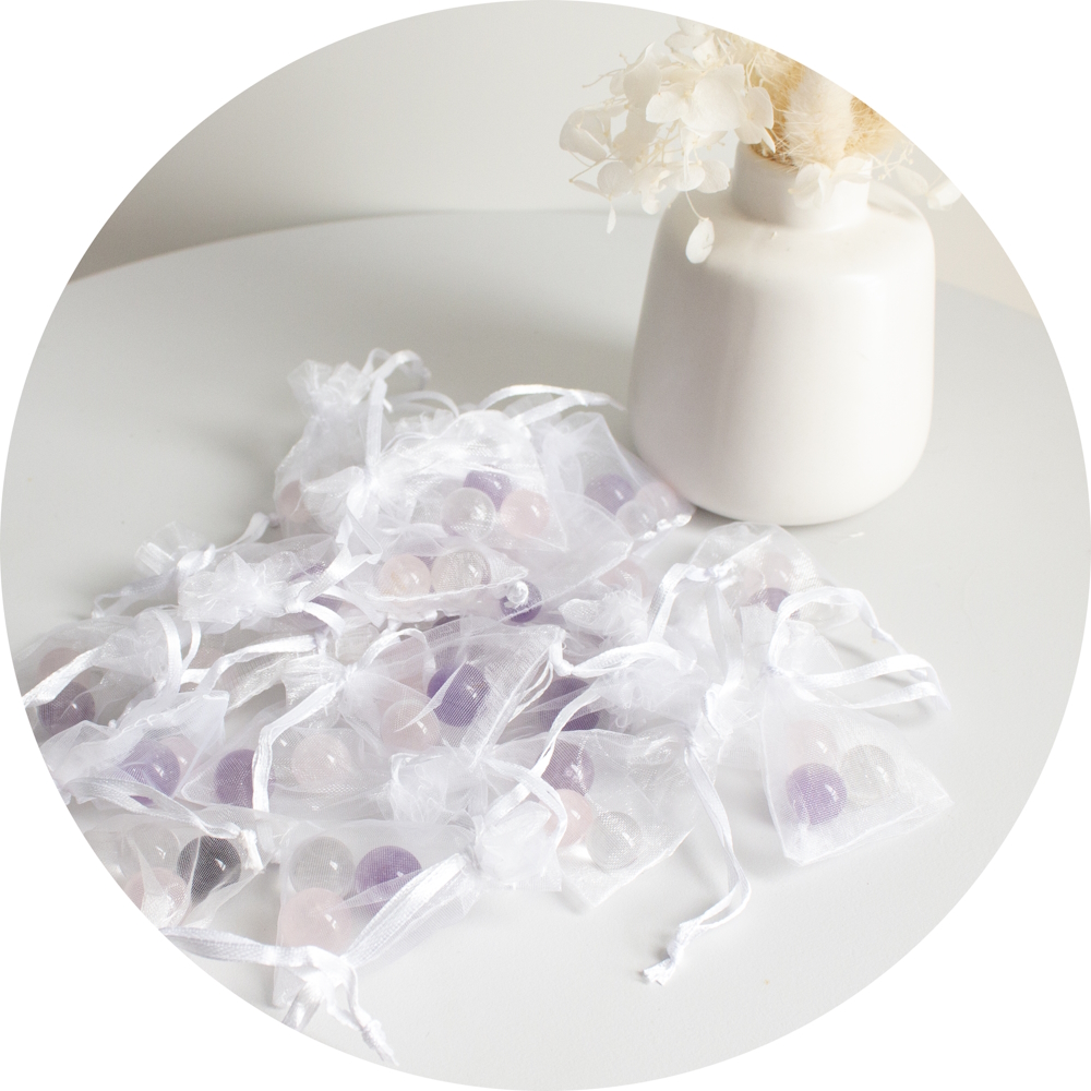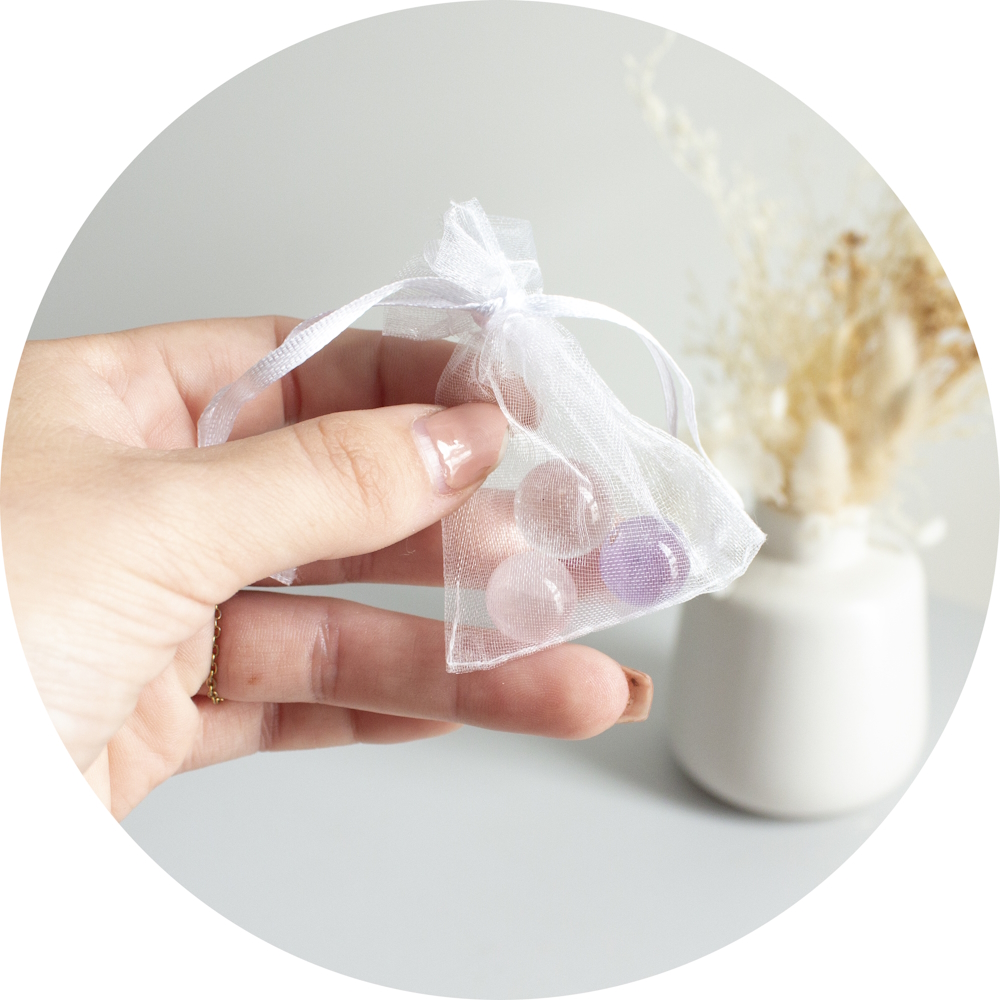 Deze edelsteen bolletjes set wordt geleverd in een wit organza zakje.