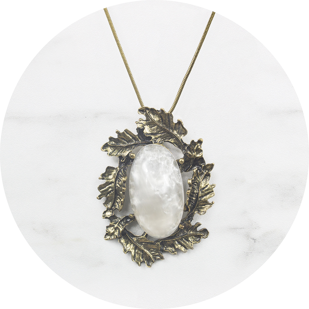 De ketting heeft een ovaalvormige parel hanger met rondom bladeren.