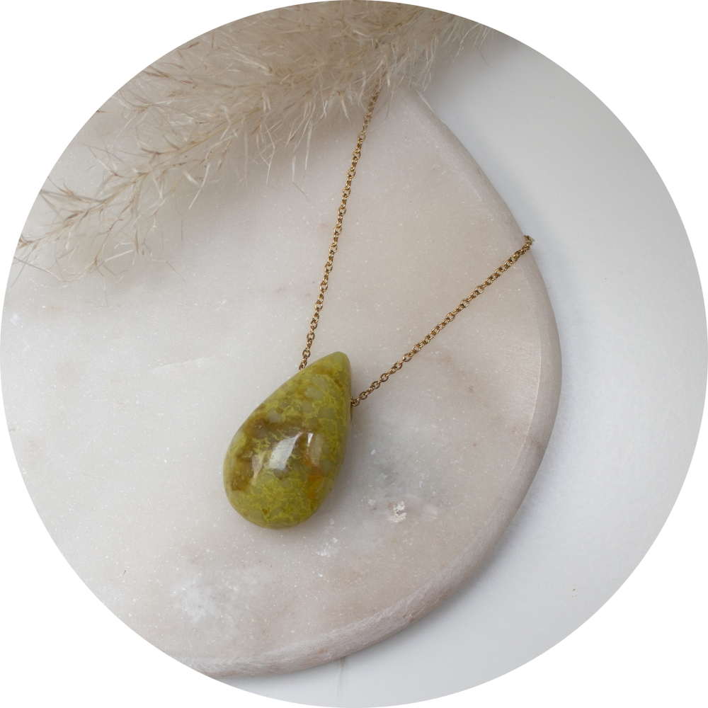 Deze groene opaal hanger heeft de vorm van een druppel en maakt je outfit helemaal compleet.