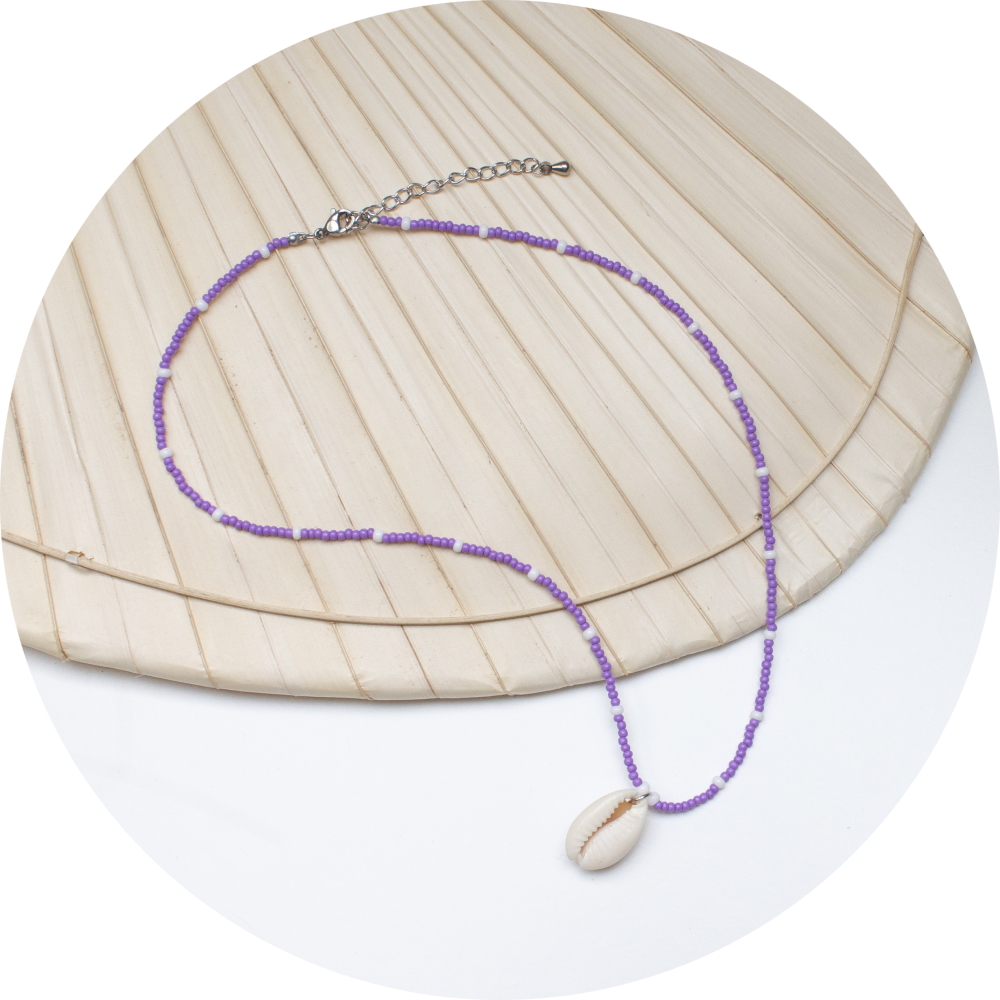 De ketting heeft een RVS sluiting en is geregen met paars & witte rocailles.