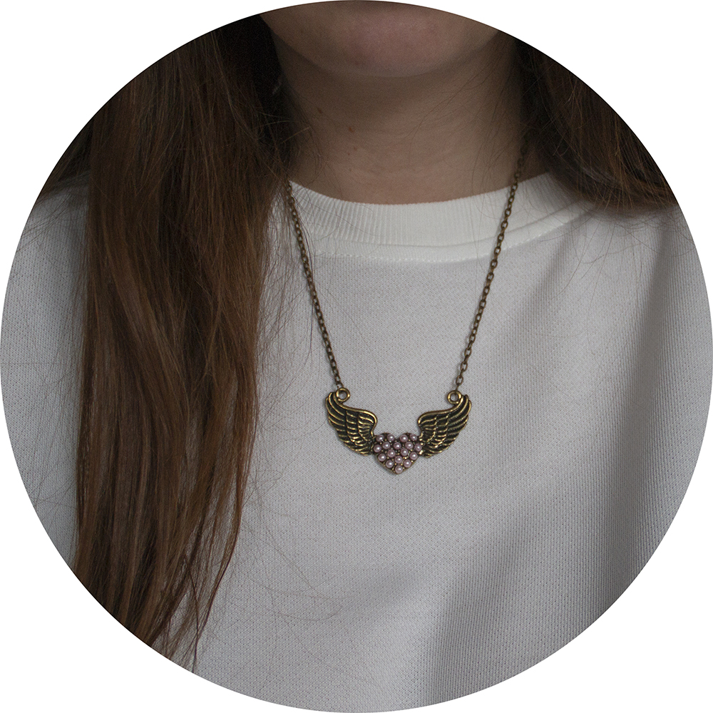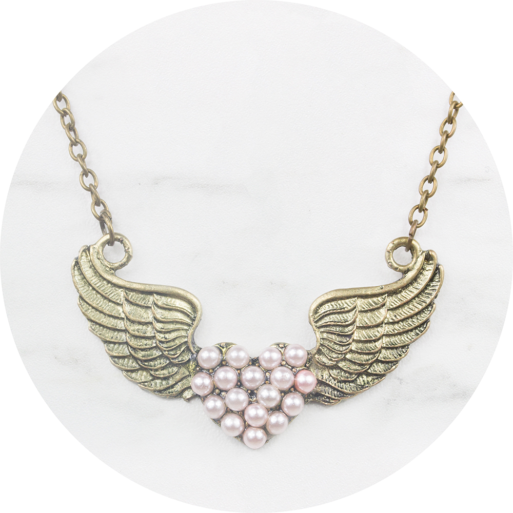 De ketting heeft een schattige hart met vleugels hanger gevuld met roze pareltjes.