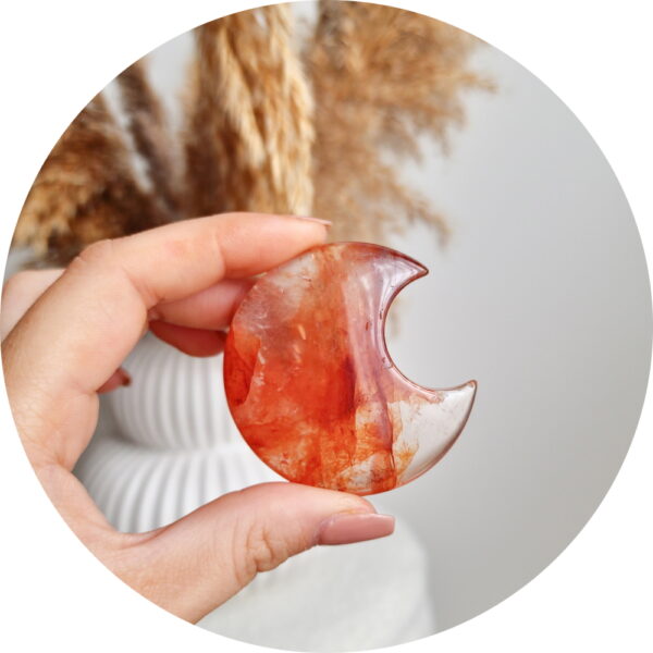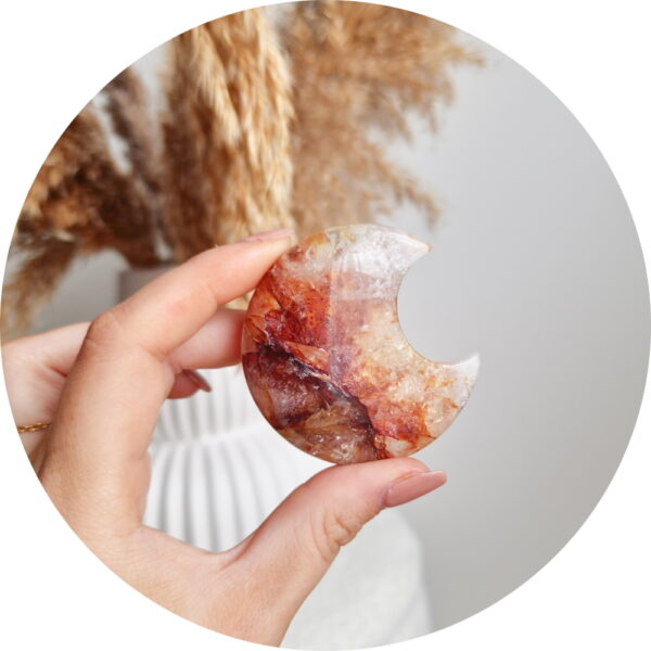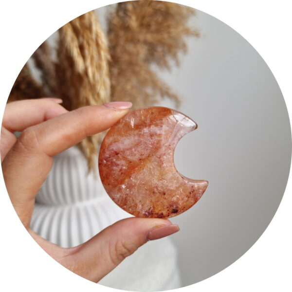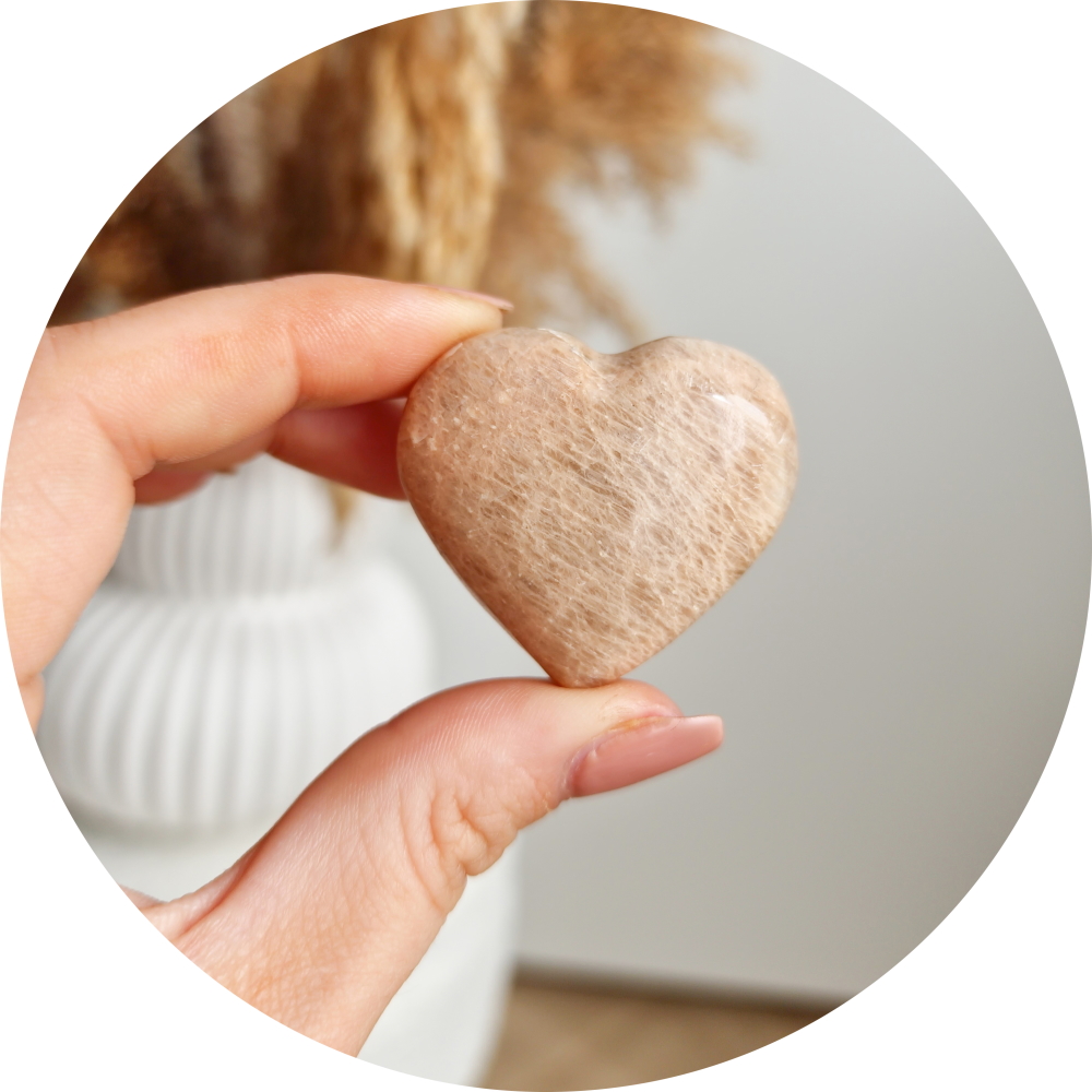 • Verzorging: Perzik maansteen is een hele zachte en broze steen. Er komen gemakkelijk krassen in en hij is zeer breekbaar. Chemicaliën, fel zonlicht en water zo veel mogelijk te vermijden. Als de steen zijn glans verliest kan je deze opwrijven met een doek met eventueel wat olie erop. Maansteen kan natuurlijk bijzonder goed opgeladen worden in het maanlicht.