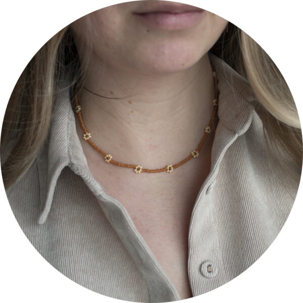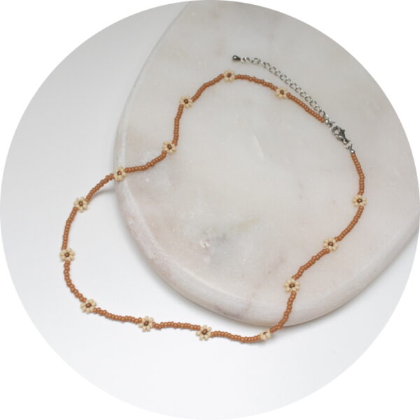 Ketting kleine bloemen kralen bruin/geel