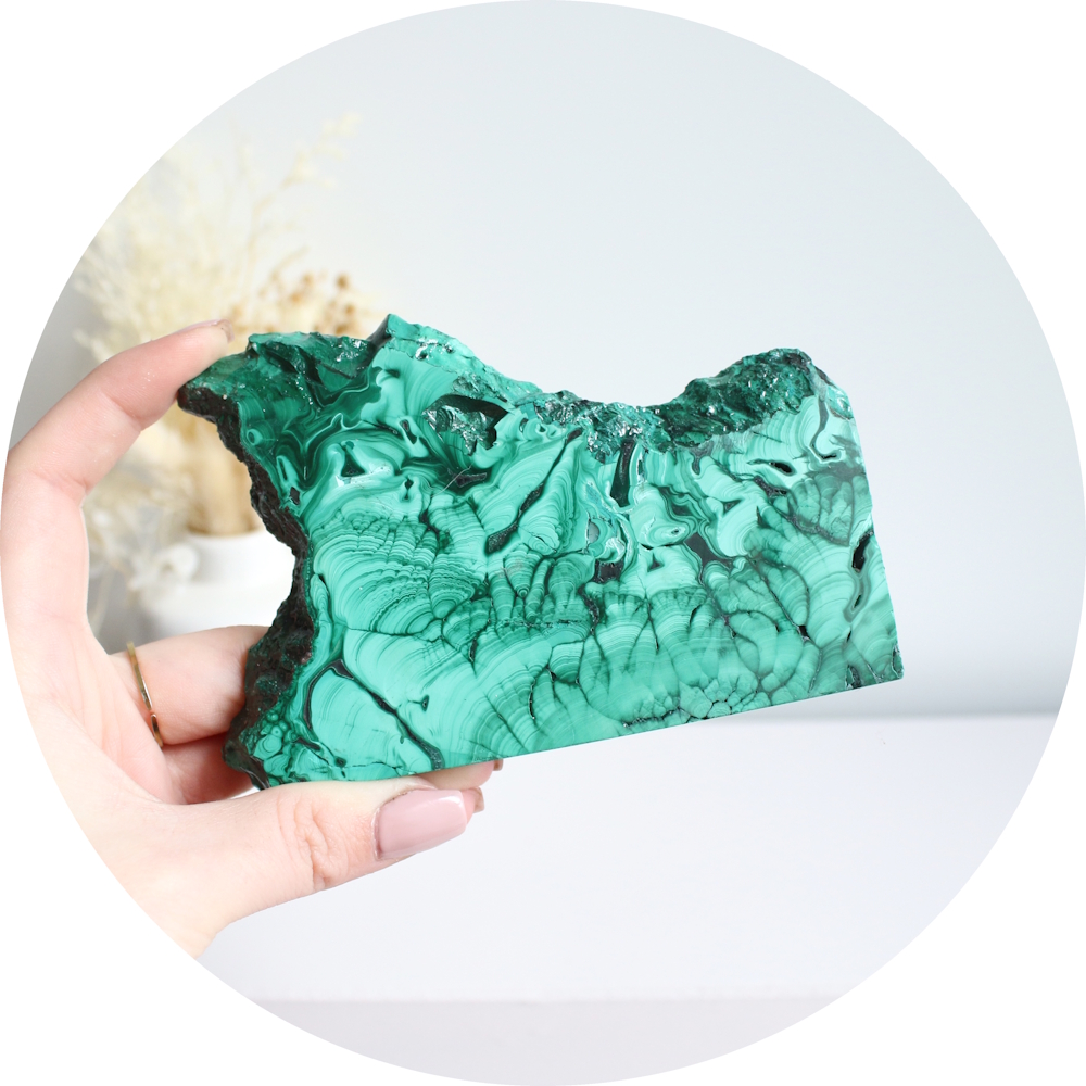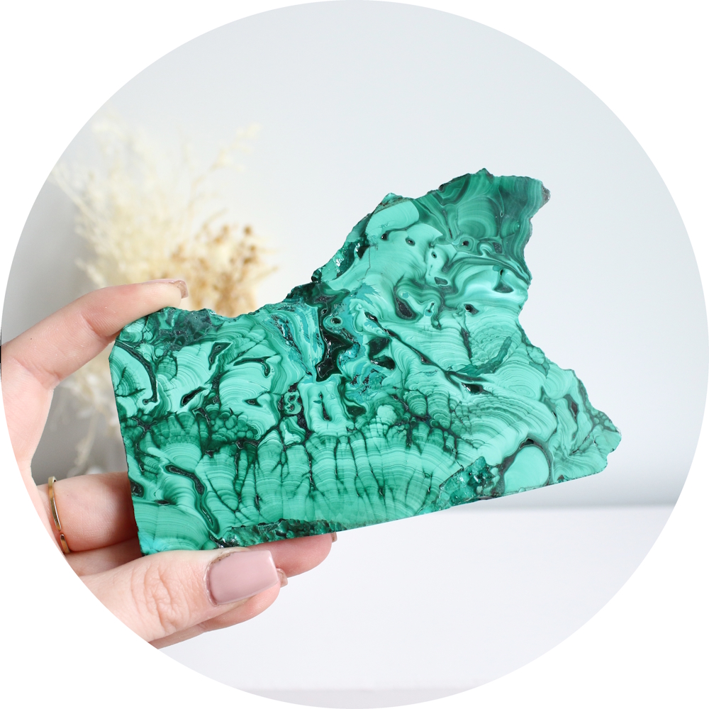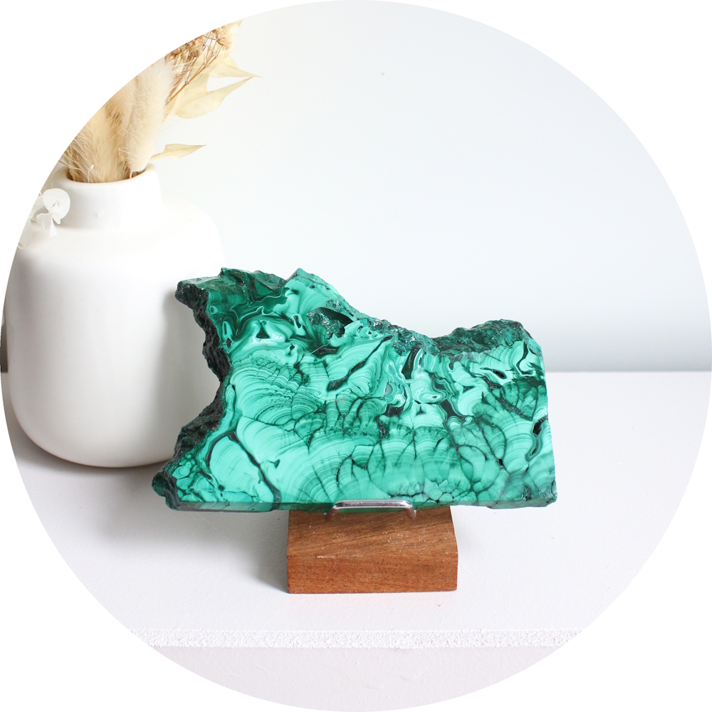 • Verzorging: Malachiet niet reinigen met water of zout want het kan hier door aangetast worden. Onder invloed van (fel) zonlicht kan malachiet zijn kleur verliezen
