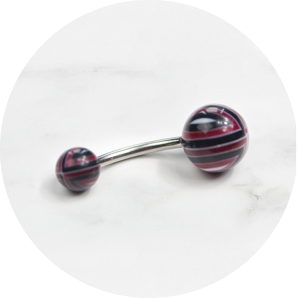 Deze opvallende rood met zwarte lijnen navelpiercing is een echte eyecatcher!