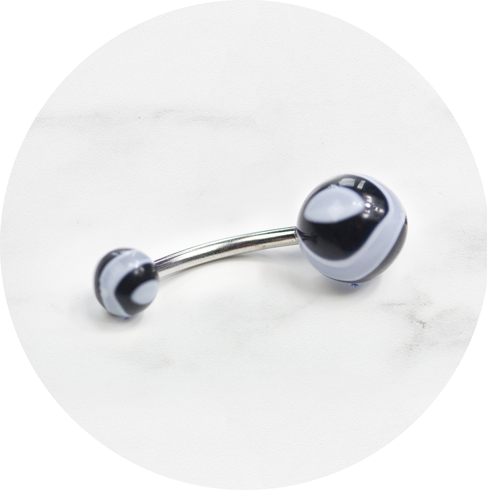 Deze opvallende zwart met witte golven navelpiercing is een echte eyecatcher!