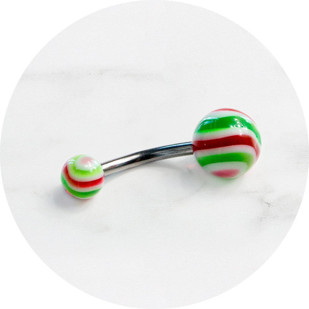Deze opvallende groen met rode golven navelpiercing is een echte eyecatcher!