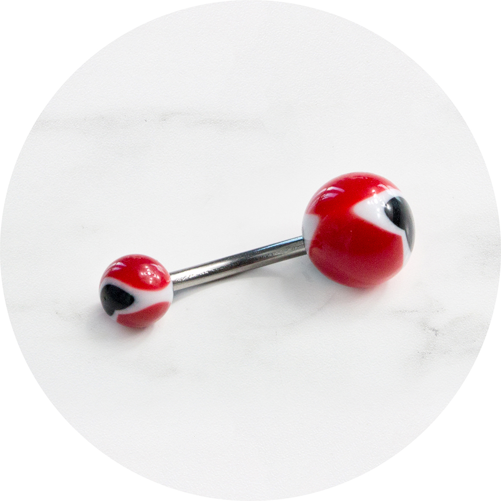 Deze opvallende rood met zwarte hart navelpiercing is een echte eyecatcher!