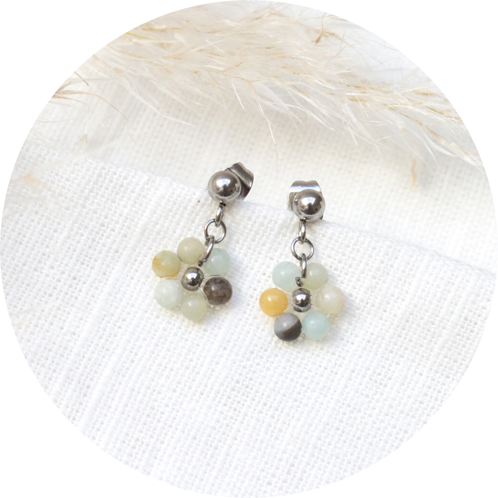 Hoe schattig zijn deze bloem oorbellen gemaakt van amazoniet kraaltjes.