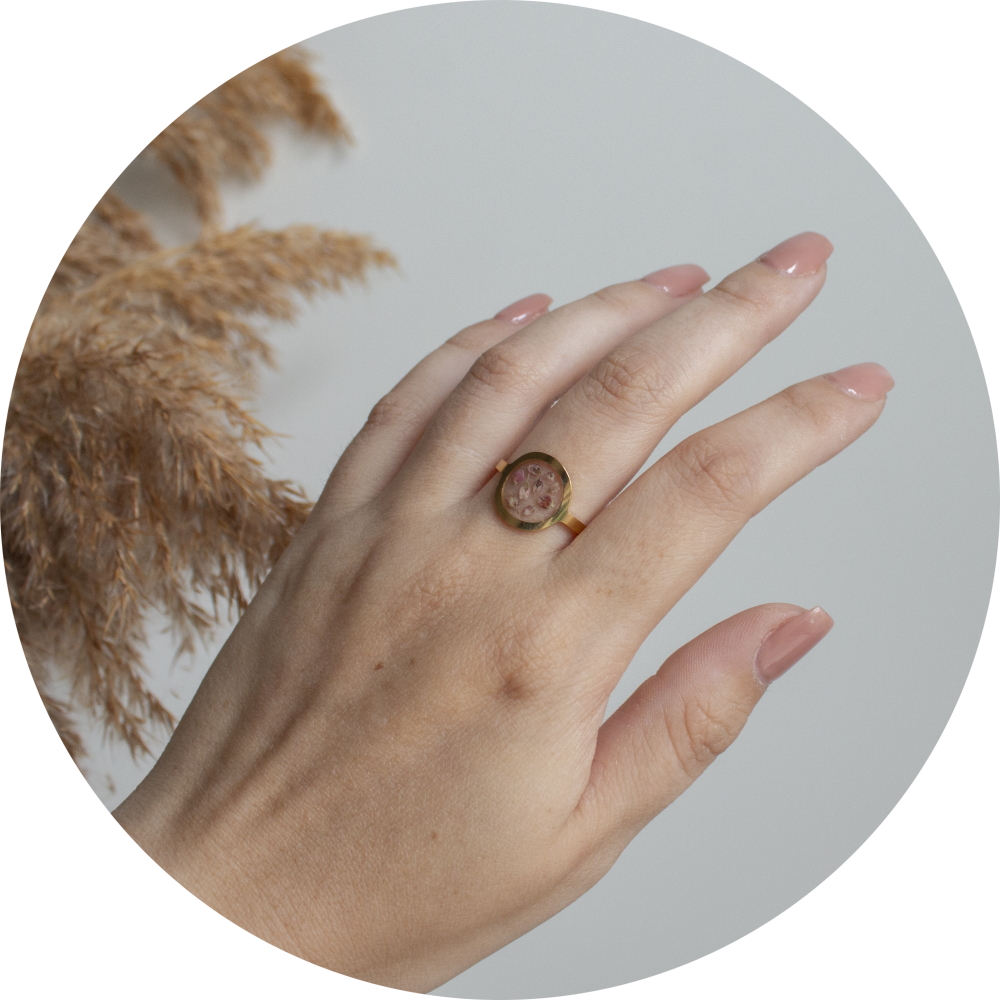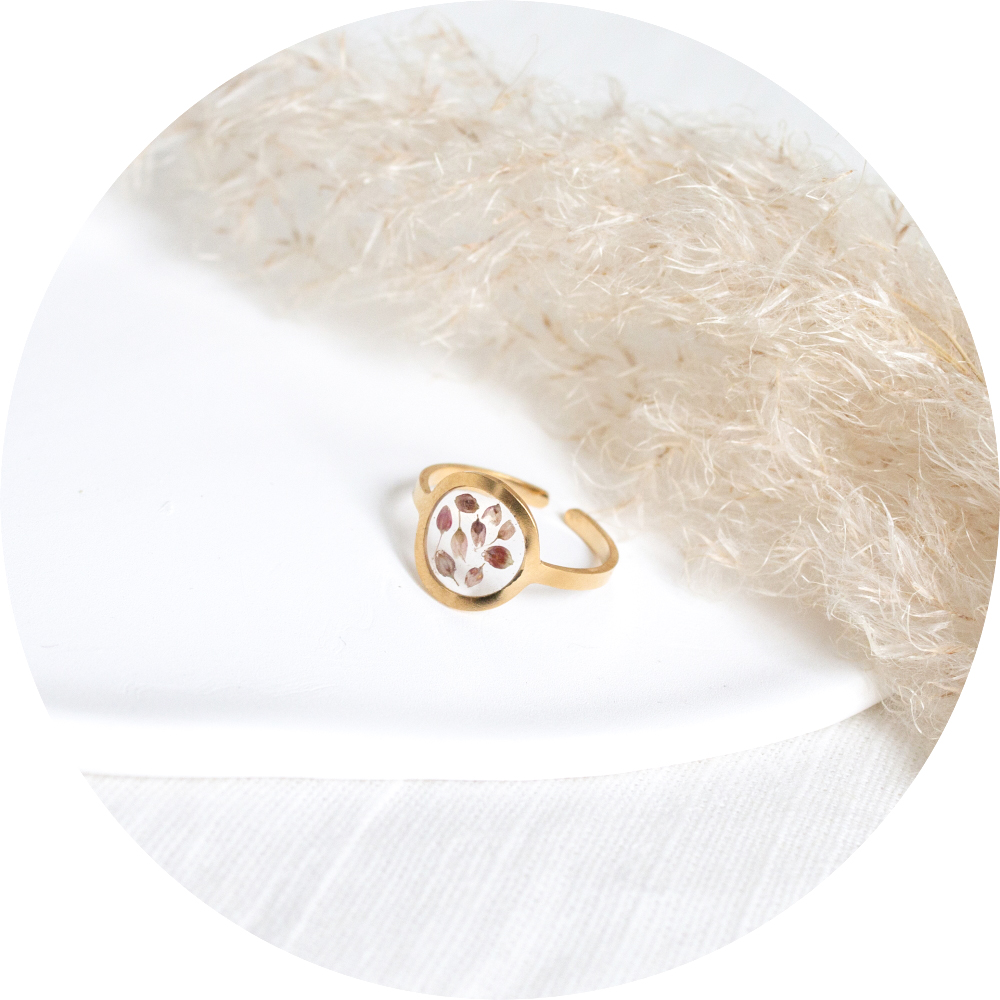 Het bijzondere aan deze ring is dat het verwerkt is met een echt gedroogd bloemetje.