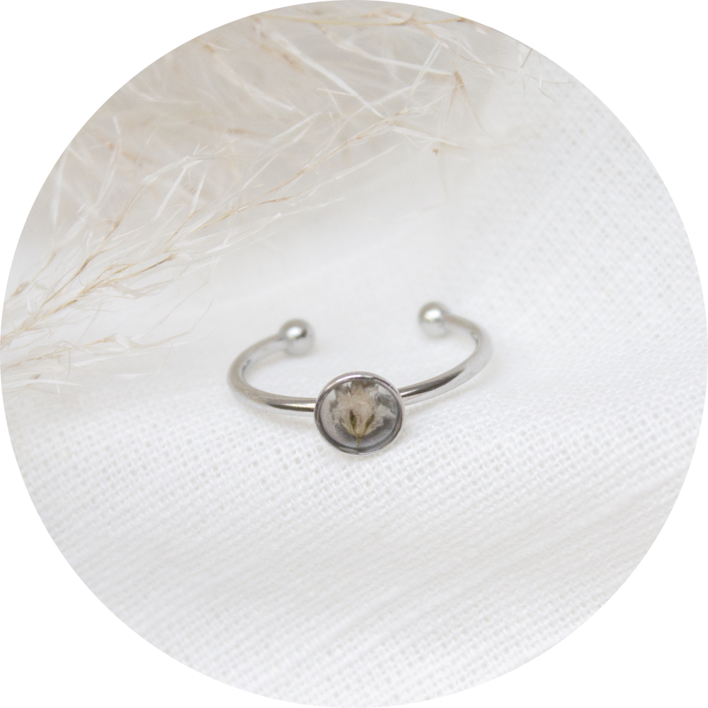 Dit prachtige ringetje heeft een wit bloemetje met de naam gipskruid in een cirkelvormige cabochon.