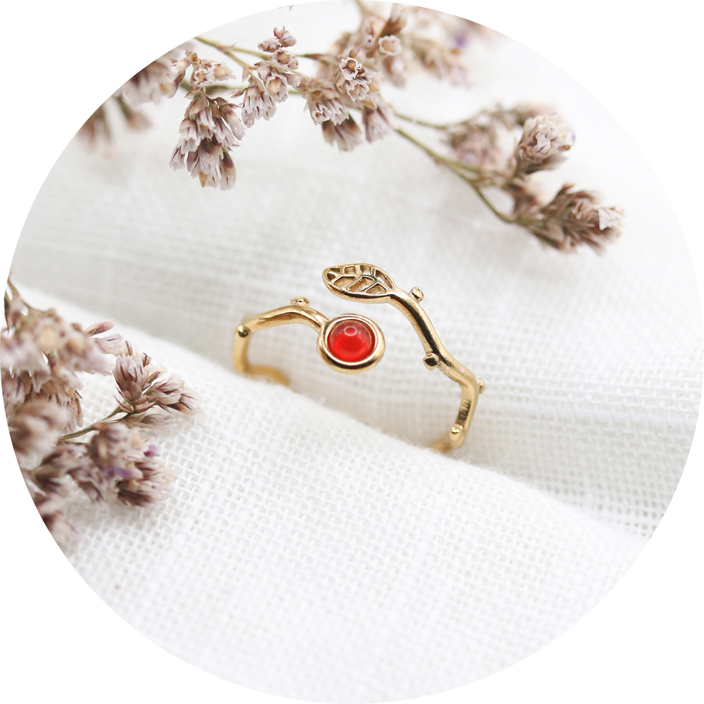 De Fiona edelsteen ring is een elegante eyecatcher met een sierlijk blad design, afgewerkt met een subtiele 3 mm rode agaat steen.