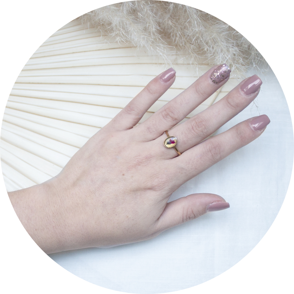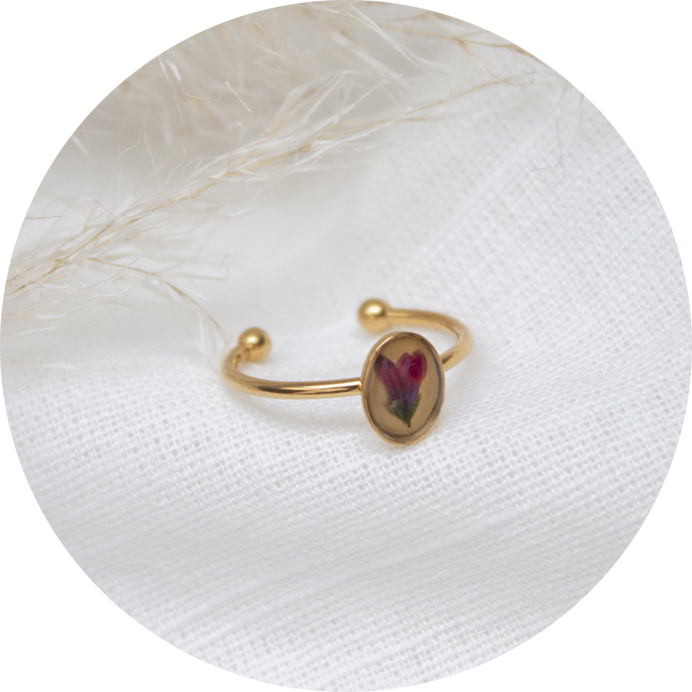 Het bijzondere aan deze ring is dat het verwerkt is met een echt gedroogd bloemetje.