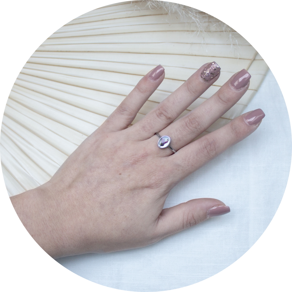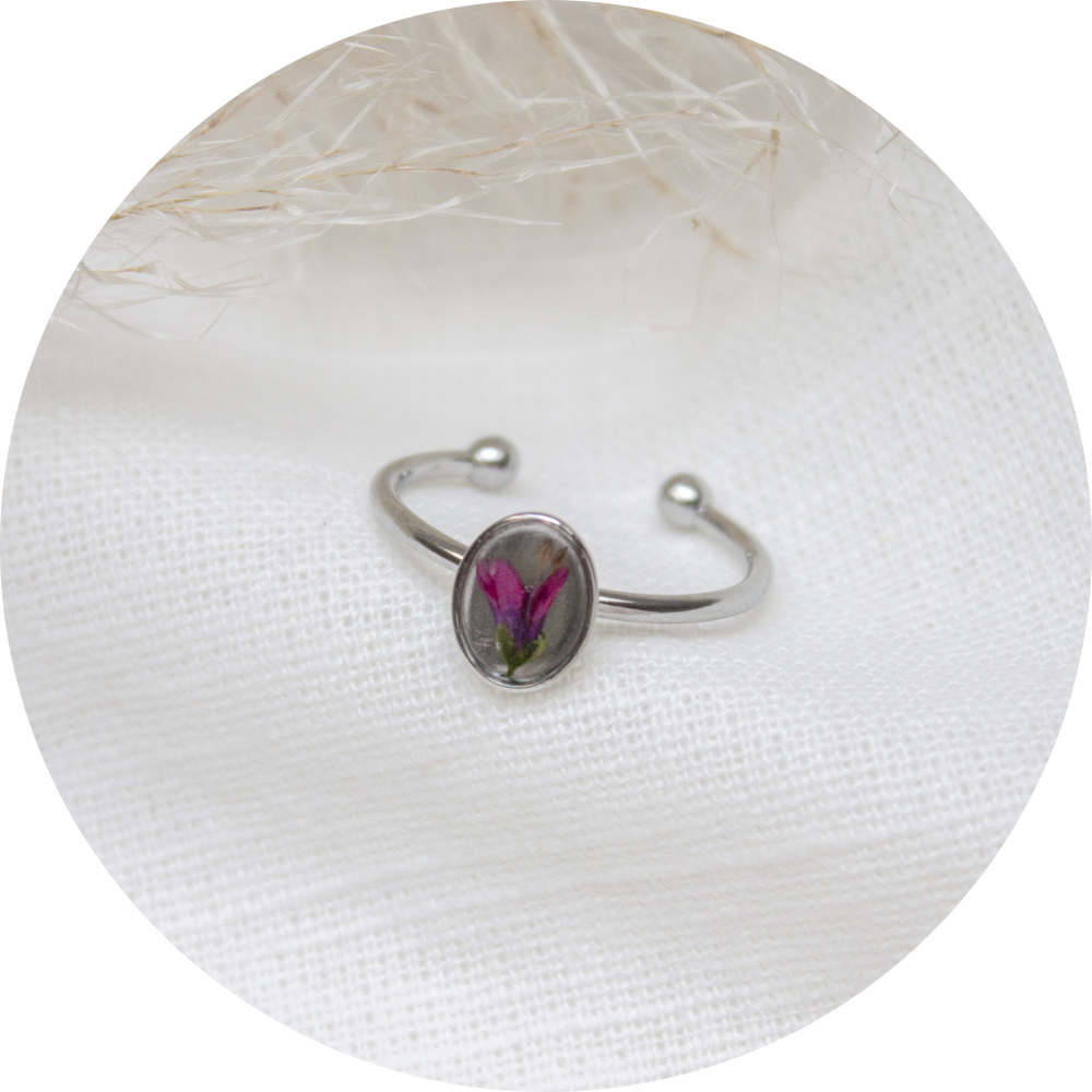 Dit prachtige ringetje heeft een roze bloemetje met de naam struikveronica in een ovaalvormige cabochon.