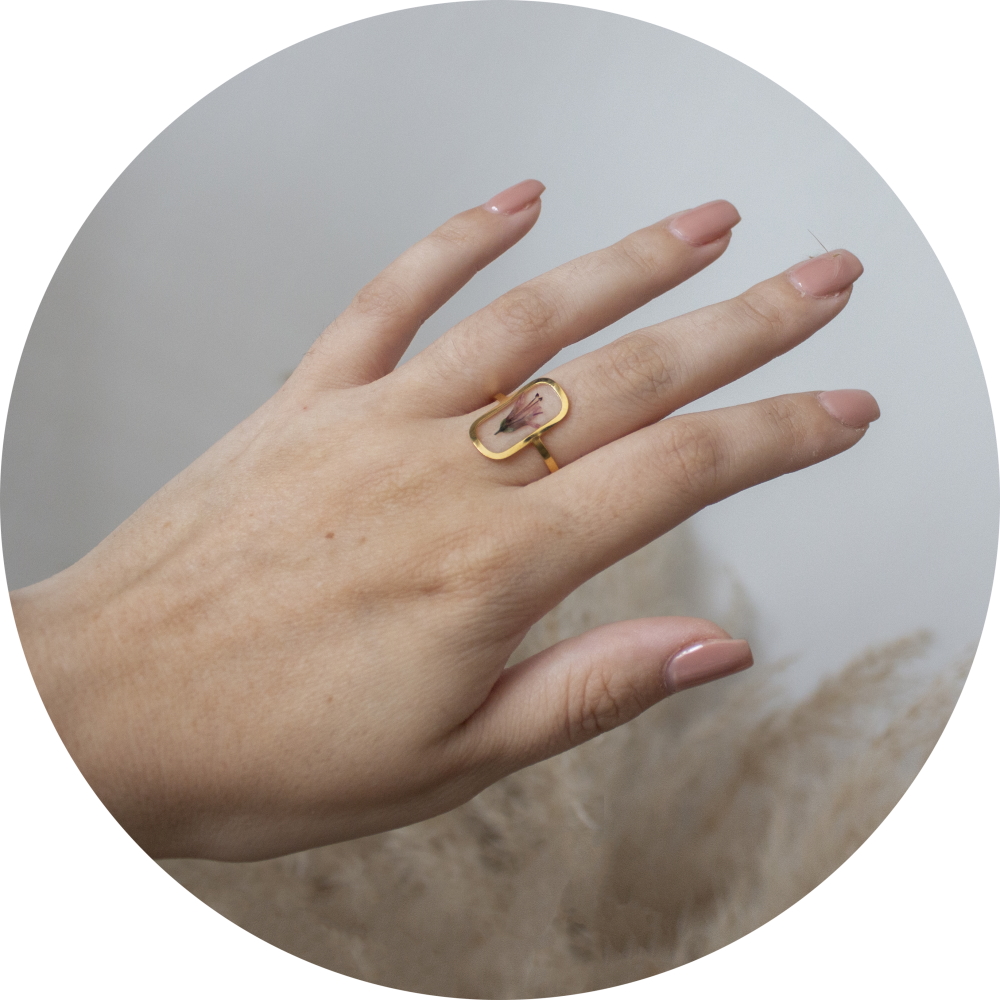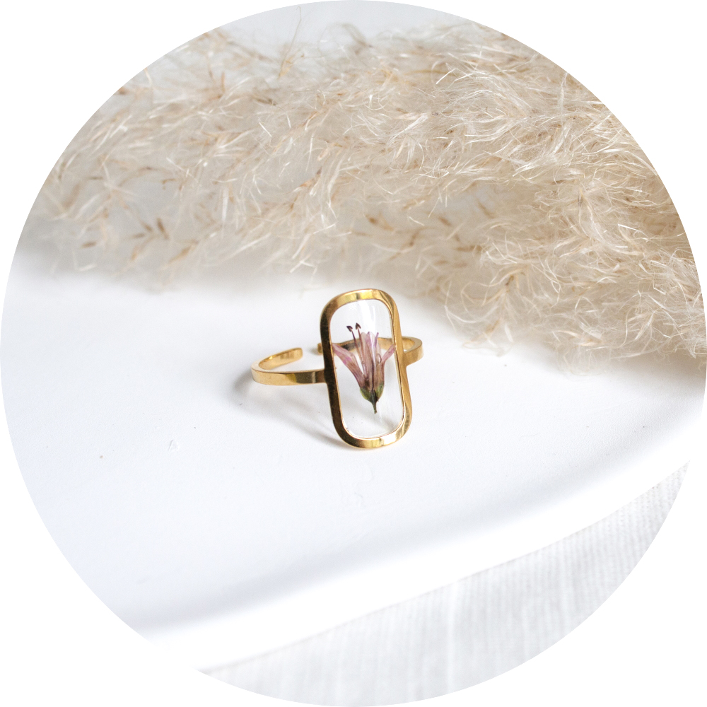 Het bijzondere aan deze ring is dat het verwerkt is met een echt gedroogd bloemetje.