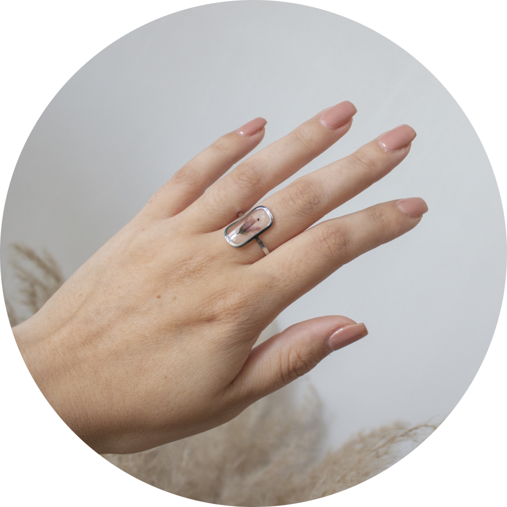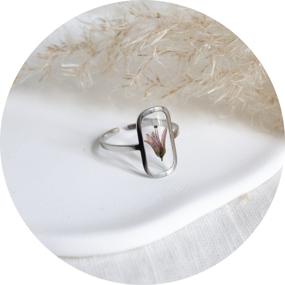 Het bijzondere aan deze ring is dat het verwerkt is met een echt gedroogd bloemetje.