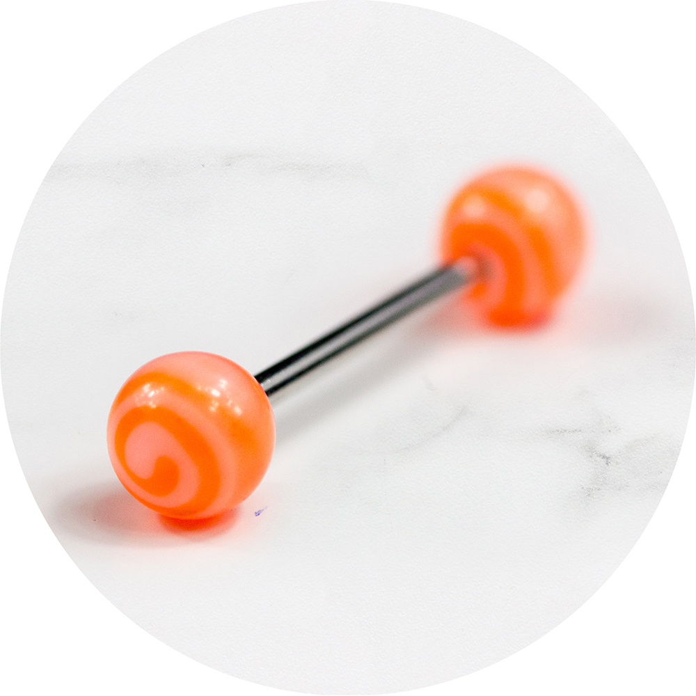 Deze opvallende oranje tornado tongpiercing is een echte eyecatcher!