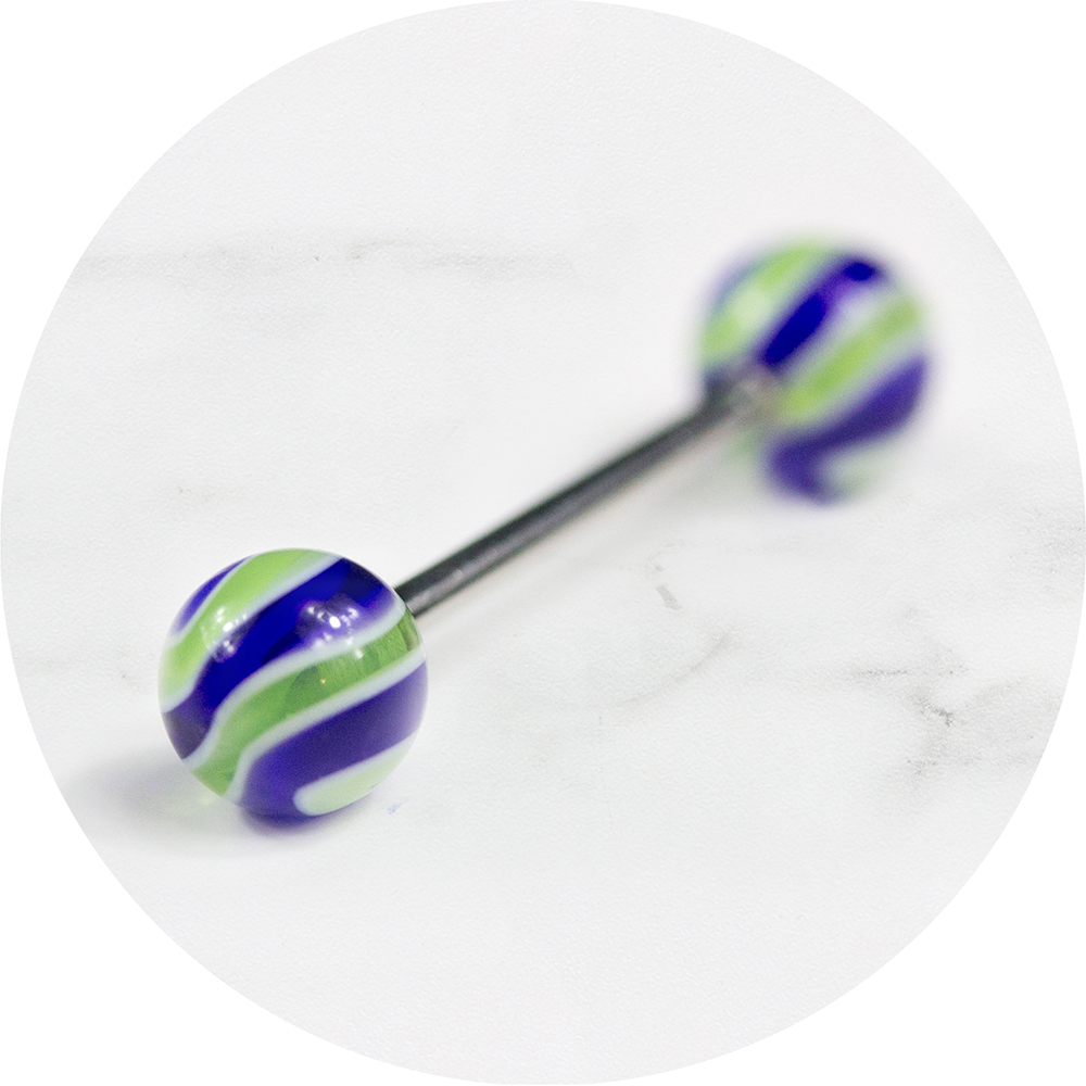Deze opvallende groen met blauwe golven tongpiercing. Een echte eyecatcher!