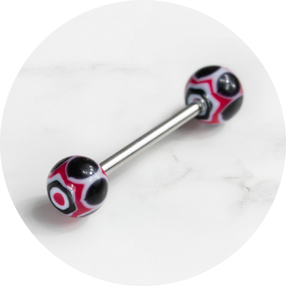 Deze opvallende zwart met rode spinnenweb tongpiercing is een echte eyecatcher!