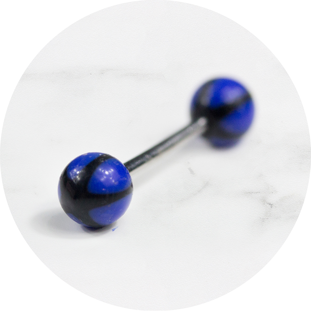 Deze opvallende blauw met zwarte ster tongpiercing is een echte eyecatcher!