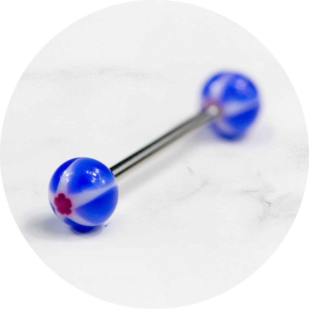 Deze opvallende blauwe ster met bloem tongpiercing is een echte eyecatcher!