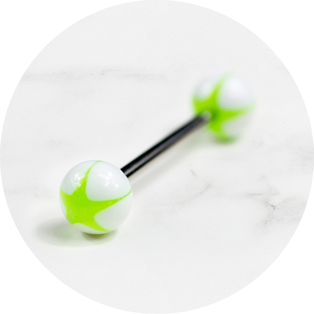 Deze opvallende wit met groene ster tongpiercing is een echte eyecatcher!