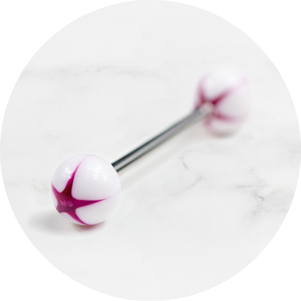 Deze opvallende wit met paarse ster tongpiercing is een echte eyecatcher!