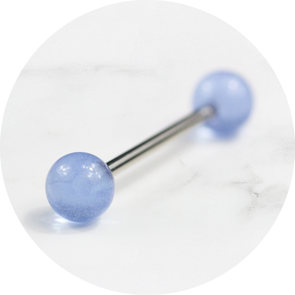 Deze opvallende licht blauwe doorzichtige tongpiercing is een echte eyecatcher!